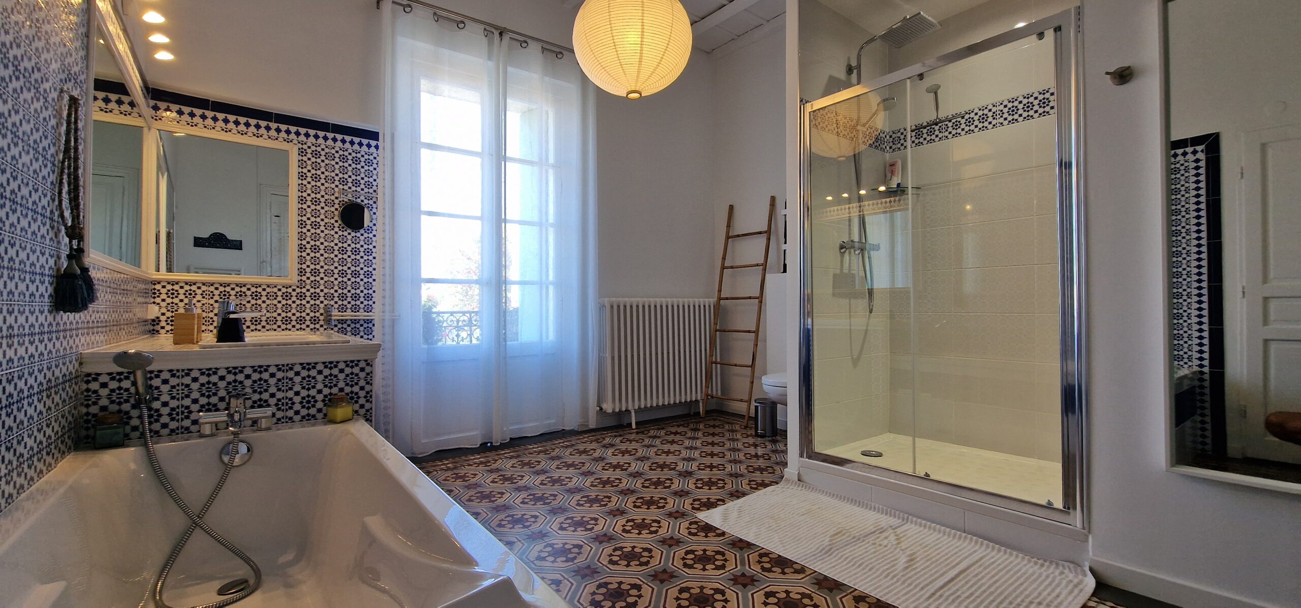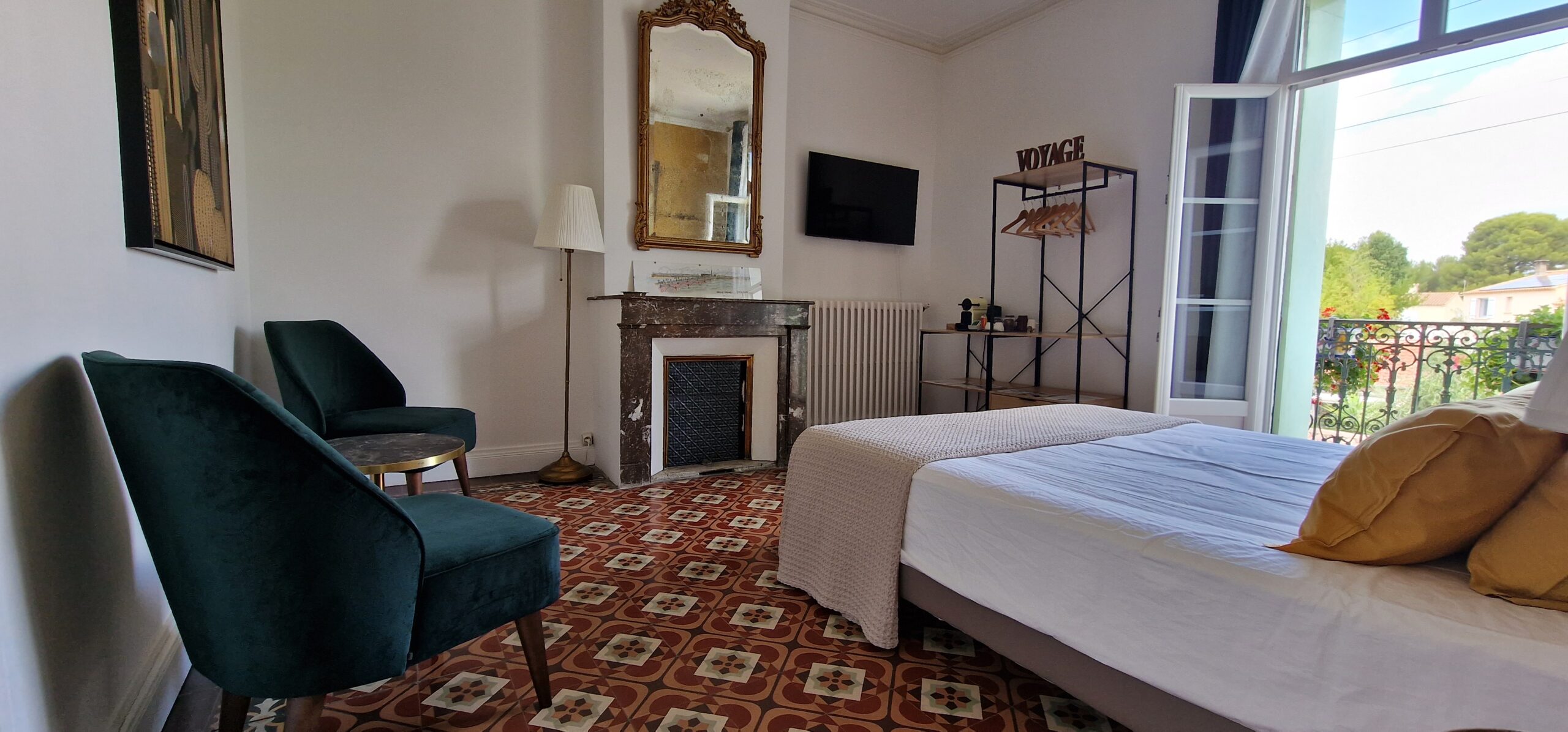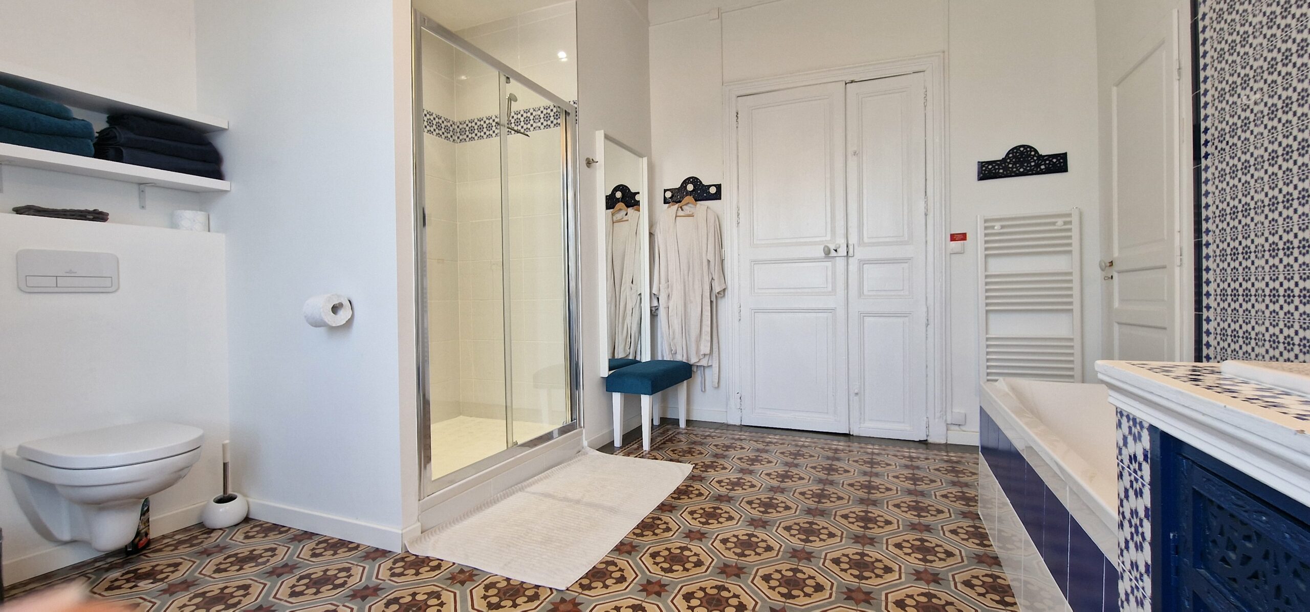 Grande suite climatisée de 30 m² composée d’une chambre avec cheminée, balcon et d’une salle de bain avec double vasque, douche, baignoire et WC.