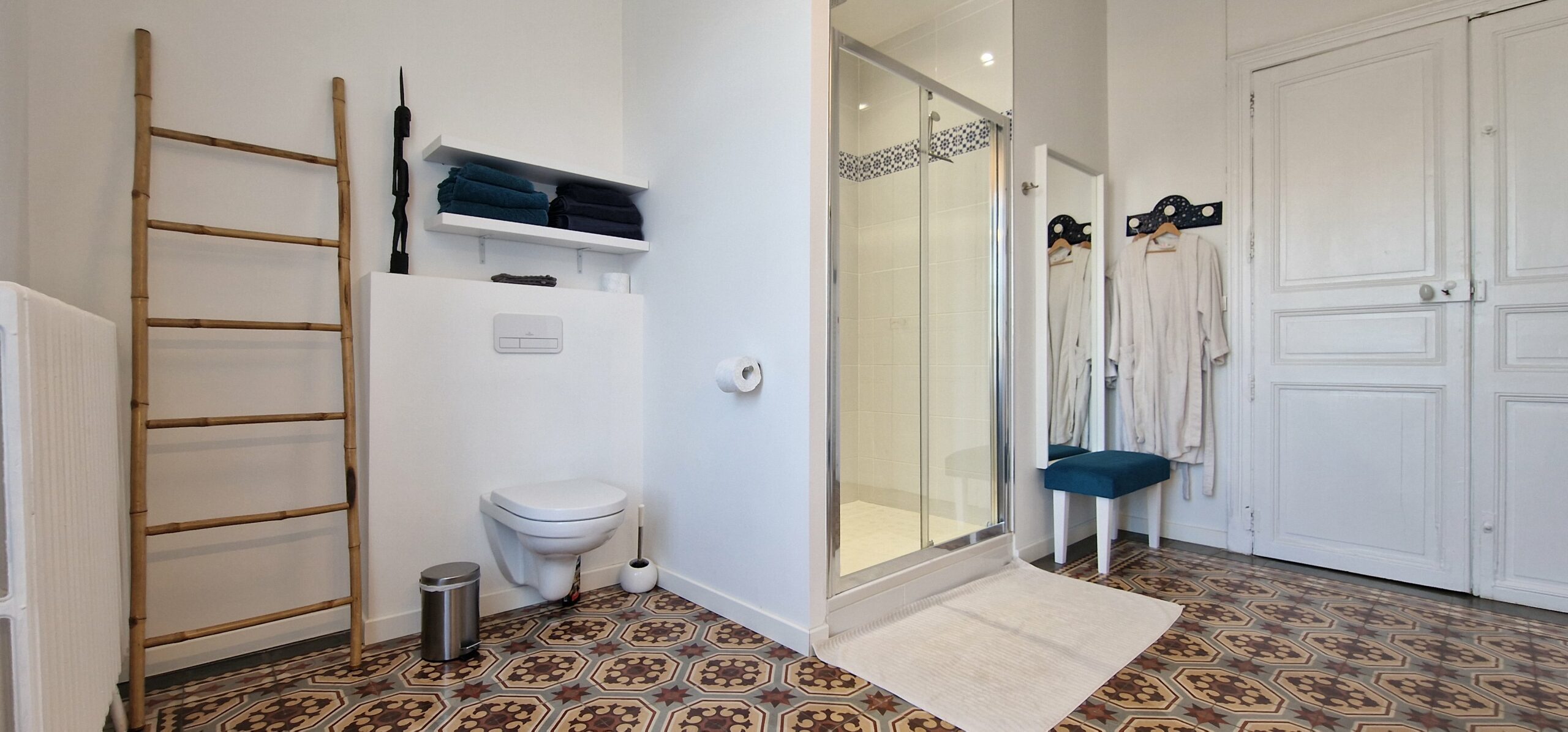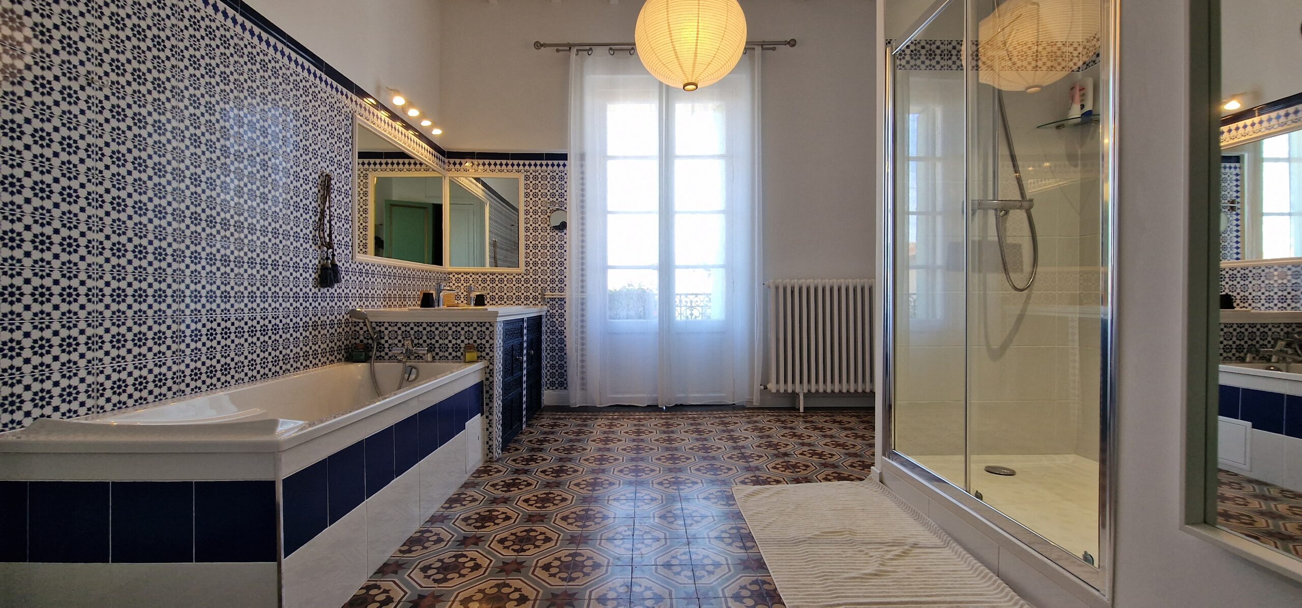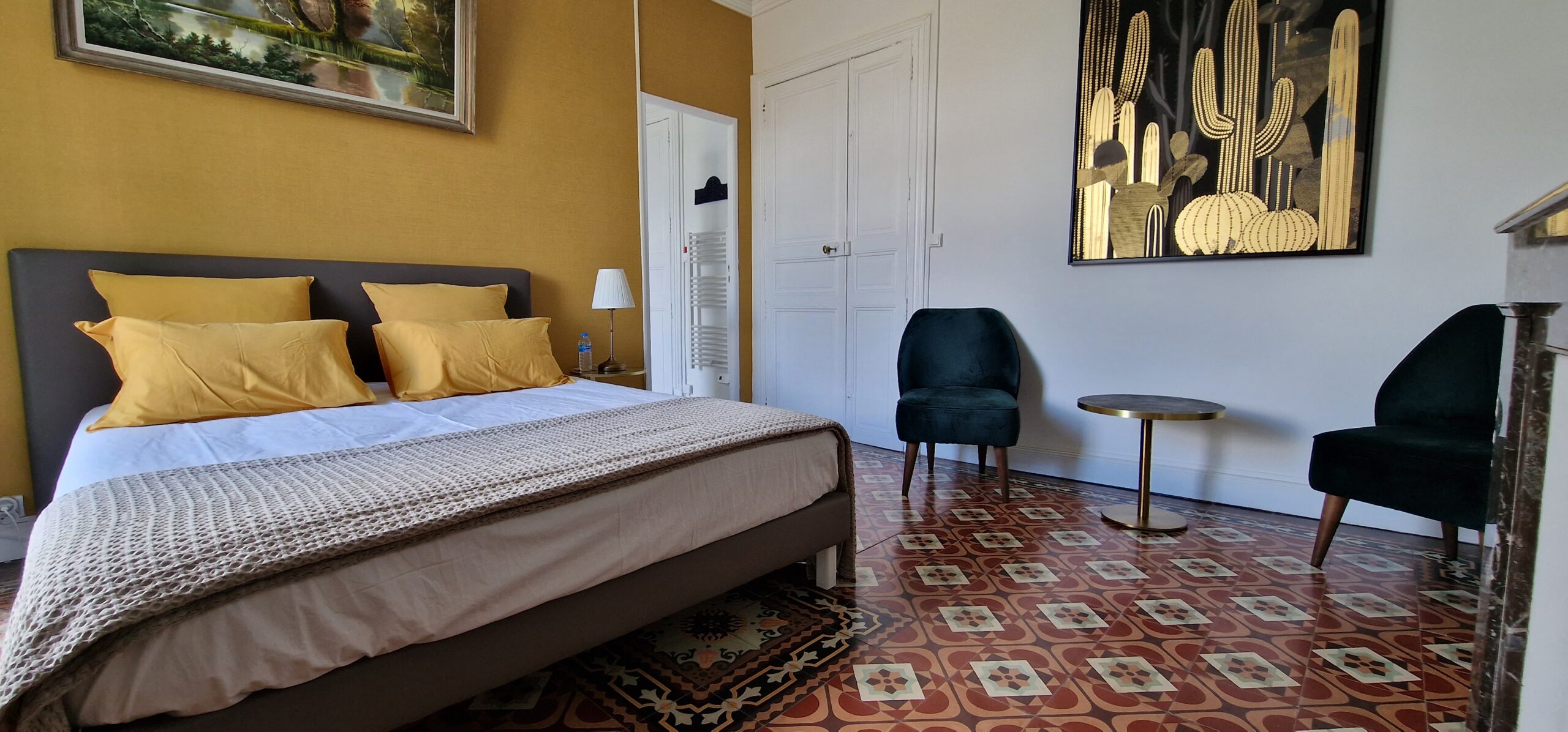 Grande suite climatisée de 30 m² composée d’une chambre avec cheminée, balcon et d’une salle de bain avec double vasque, douche, baignoire et WC.